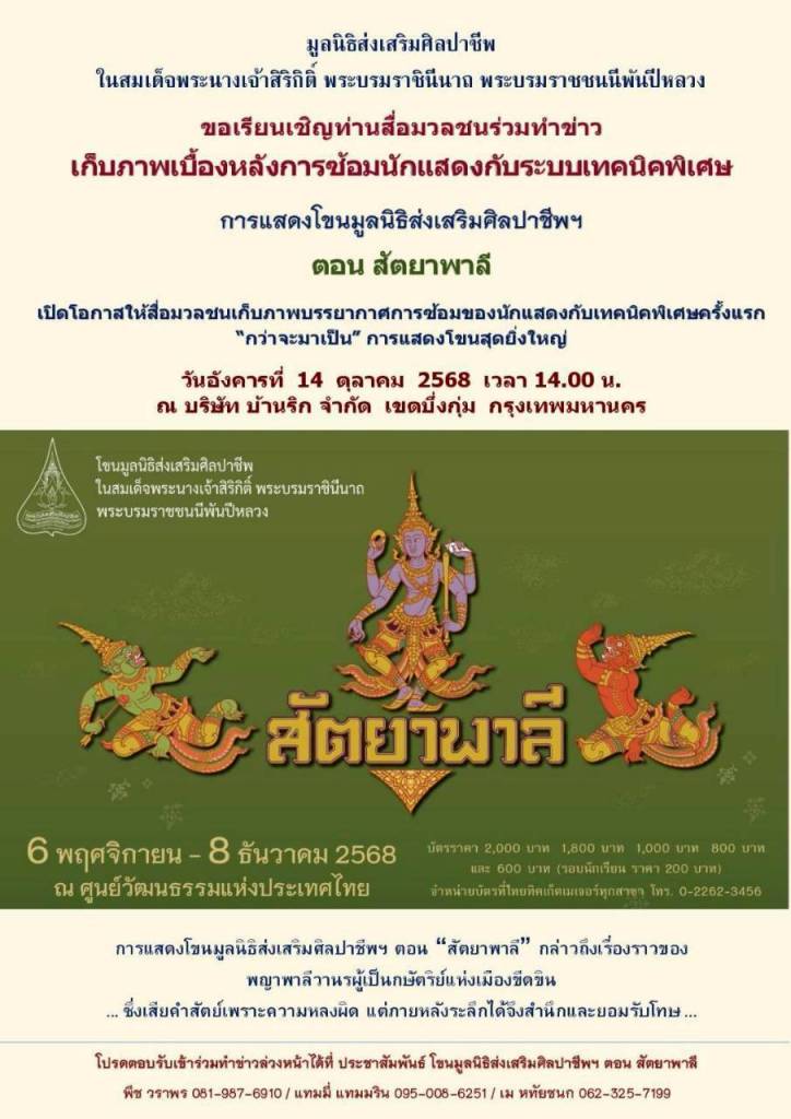 เมื่อวันพฤหัสบดีที่ 4 กันยายน 2568 มูลนิธิส่งเสริมศิลปาชีพฯ จัดงาน แถลงข่าวเปิดการแสดงโขนมูลนิธิส่งเสริมศิลปาชีพฯ เรื่องรามเกียรติ์ ตอน “สัตยาพาลี” ณ โรงละครสำนักพระราชวัง สนามเสือป่า โดยมีบุคคลสำคัญร่วมงานคับคั่ง