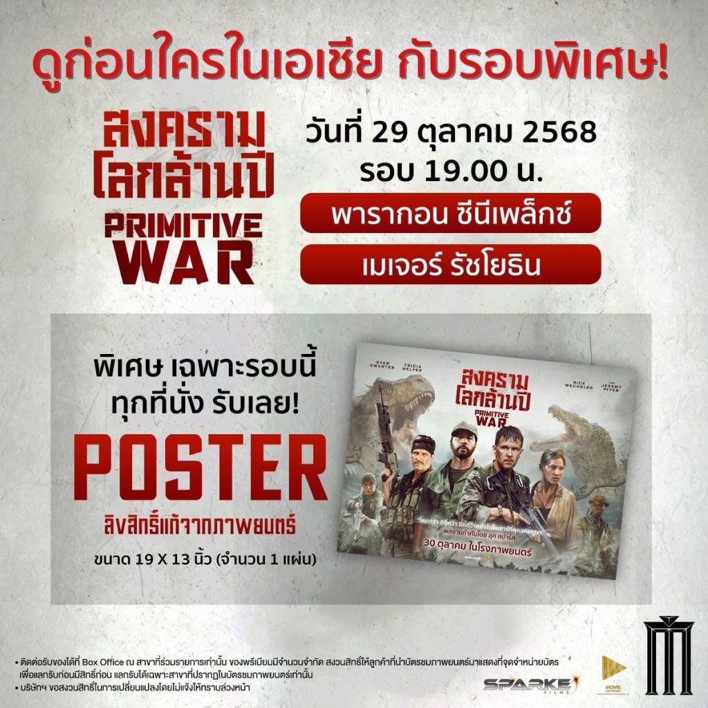 สัมผัสความยิ่งใหญ่ในรอบพิเศษของ “Primitive War – สงครามโลกล้านปี” วันพุธที่ 29 ตุลาคมนี้ รอบ 19.00 น. เฉพาะที่โรงภาพยนตร์ SF World Cinema เซ็นทรัลเวิลด์ และ SFX Cinema เซ็นทรัลลาดพร้าว “รับฟรี” Mini Poster ลิขสิทธิ์แท้จากค่ายภาพยนตร์ทุกที่นั่ง